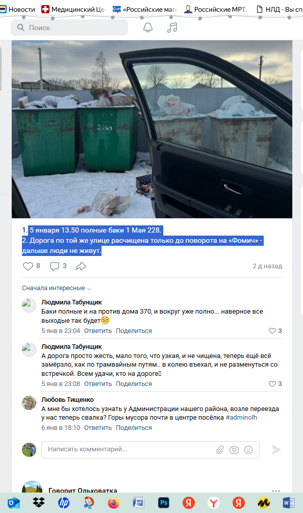 Похоже ольховатские власти ушли на каникулы и считают,что работать в это время не стоит. А в это время улицы зарастают мусором,дороги не чищены и люди возмущены этим и жалуются в соцсетях.