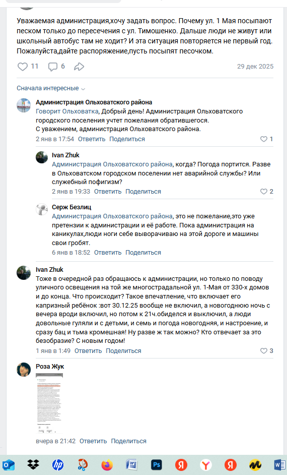 "Уважаемая администрация,хочу задать вопрос. Почему ул. 1 Мая посыпают песком только до пересечения с ул. Тимошенко. Дальше люди не живут или школьный автобус там не ходит? И эта ситуация повторяется не первый год. Пожалуйста,дайте распоряжение,пусть посыпят песочком."