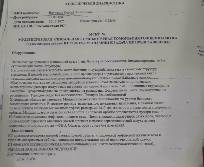 У Виткалова диагностировали:перелом нижней стенки правой орбиты;подкожную эмфизему нижнего века;закрытую черепномозговую травму;сотрясение мозга.